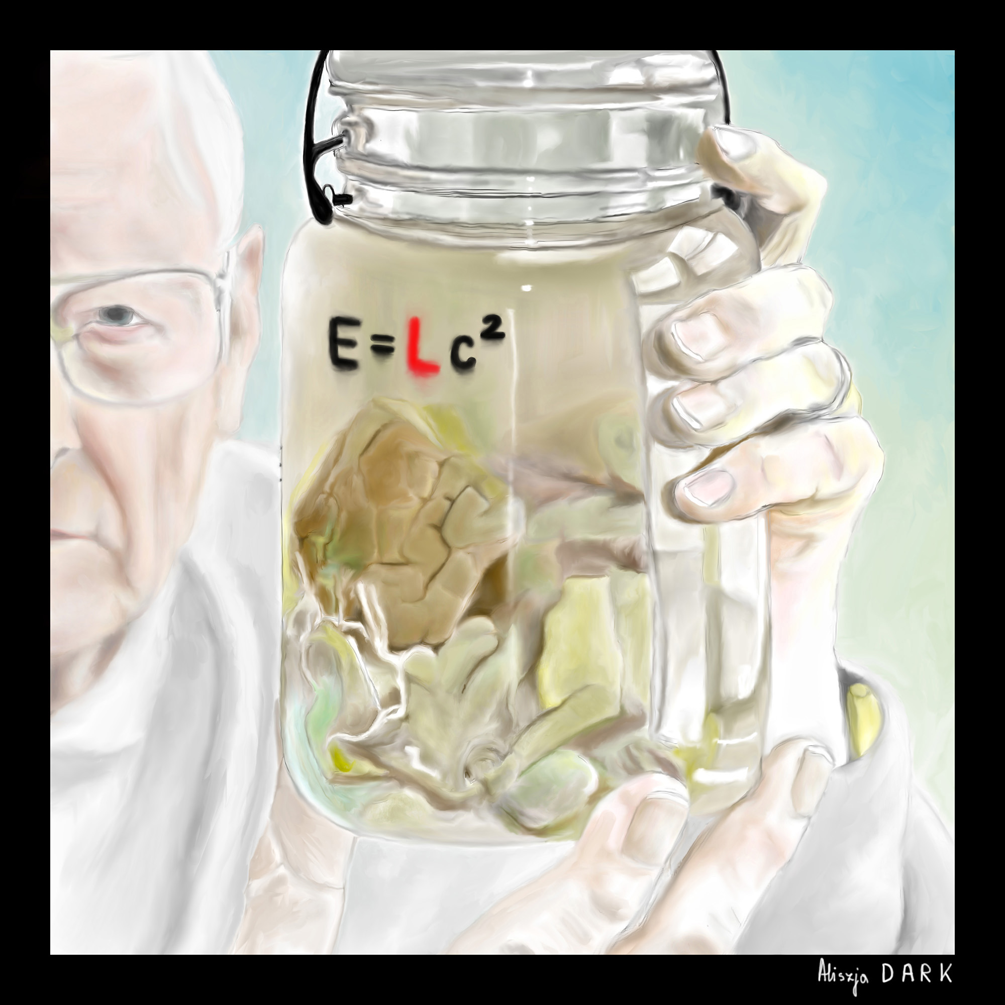 Opis: obraz przedstawia autentyczny mózg Einsteina, gdyż namalowany został na podstawie historycznego zdjęcia autorstwa Michaela Brennana (twórcy fotografii z Księżną Dianą, czy Johnem Lenonem) - oczywiście za jego pozwoleniem (thank you Michael :)). W koncepcji obrazu chodziło mi o to, by uwidocznić absurd badań nad mózgiem naukowca, których celem było doszukanie się tego, co stało za intelektem twórcy równania E=mc2. Patolog (osoba na obrazie) chciał zapewne odnieść na tym polu swój sukces, tylko nie wziął pod uwagę, że przecież Einstein chciał być skremowany, żeby zapobiec takim "naukowym" wydarzeniom. Nie wziął też pod uwagę tego, co faktycznie myślał z biegiem lat Einstein. Patolog szukał potwierdzenia na geniusz fizyki, a tam były już refleksje innego typu, o czym dowiadujemy się z listu do jego córki. Stąd też równanie na słoiku E=Lc2, gdzie L = Love, czyli miłość.
