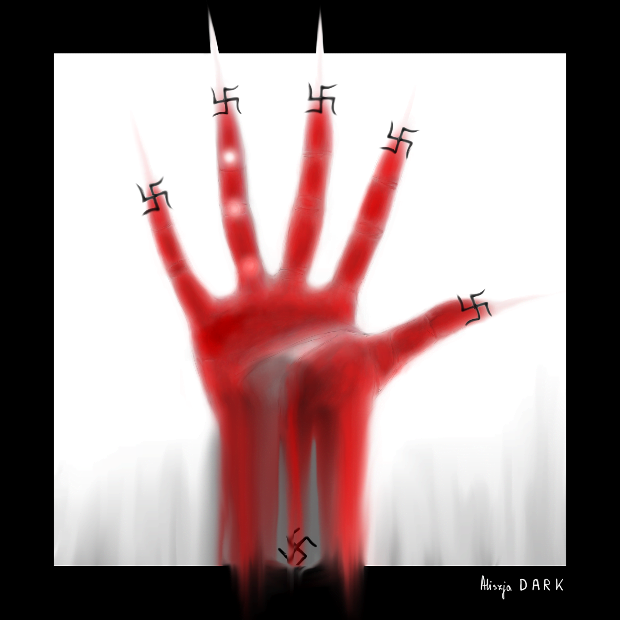 Opis: obraz przedstawia moją dłoń, która wysyła do piekła znak faszystkowski. Gdy Hitler go wymyślał wzorował się na pierwotnych swastykach o znaczeniu szczęścia - buddyjska, słowiańska itd.. Symbol tych drugich przedstawiam na górze - na palcach dłoni. Te znaki nie są groźne. Groźne są zawsze ludzkie paranoje i sądy bez wyrobionego dystansu do rzeczywistości, który pozwala na właściwą jej ocenę, w tym kontrolę znaczeń, tekstu itd..