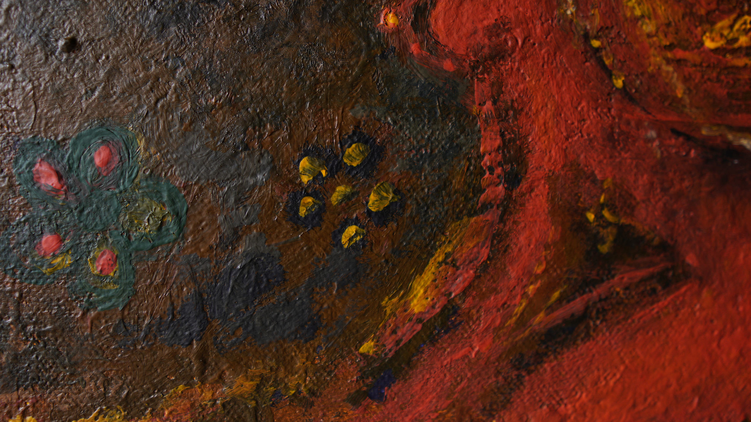 The painting contains bulges created by thickly applied paint, which makes it seem a bit leathery, and unique colors. Warm, quite bright red is combined with a background of warm brown mixed with green. There is masculine fire and feminine delicacy in the painting.