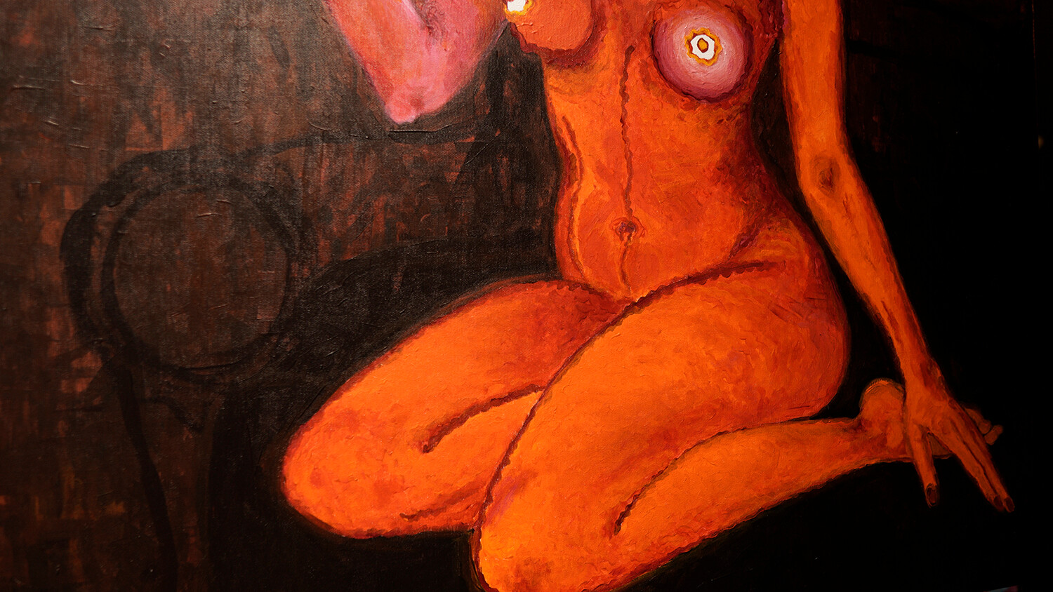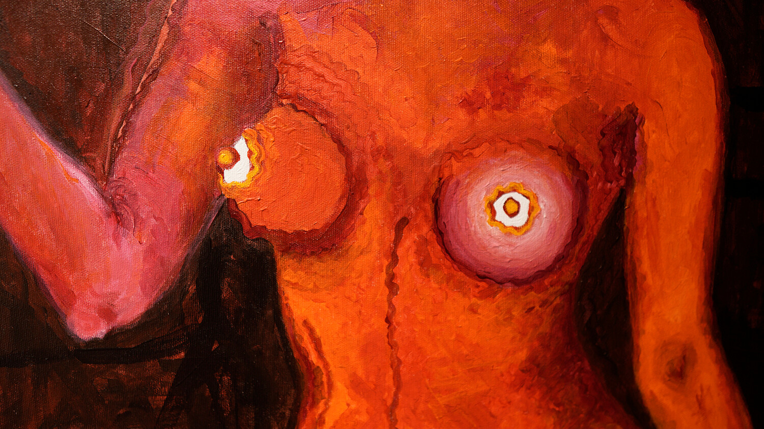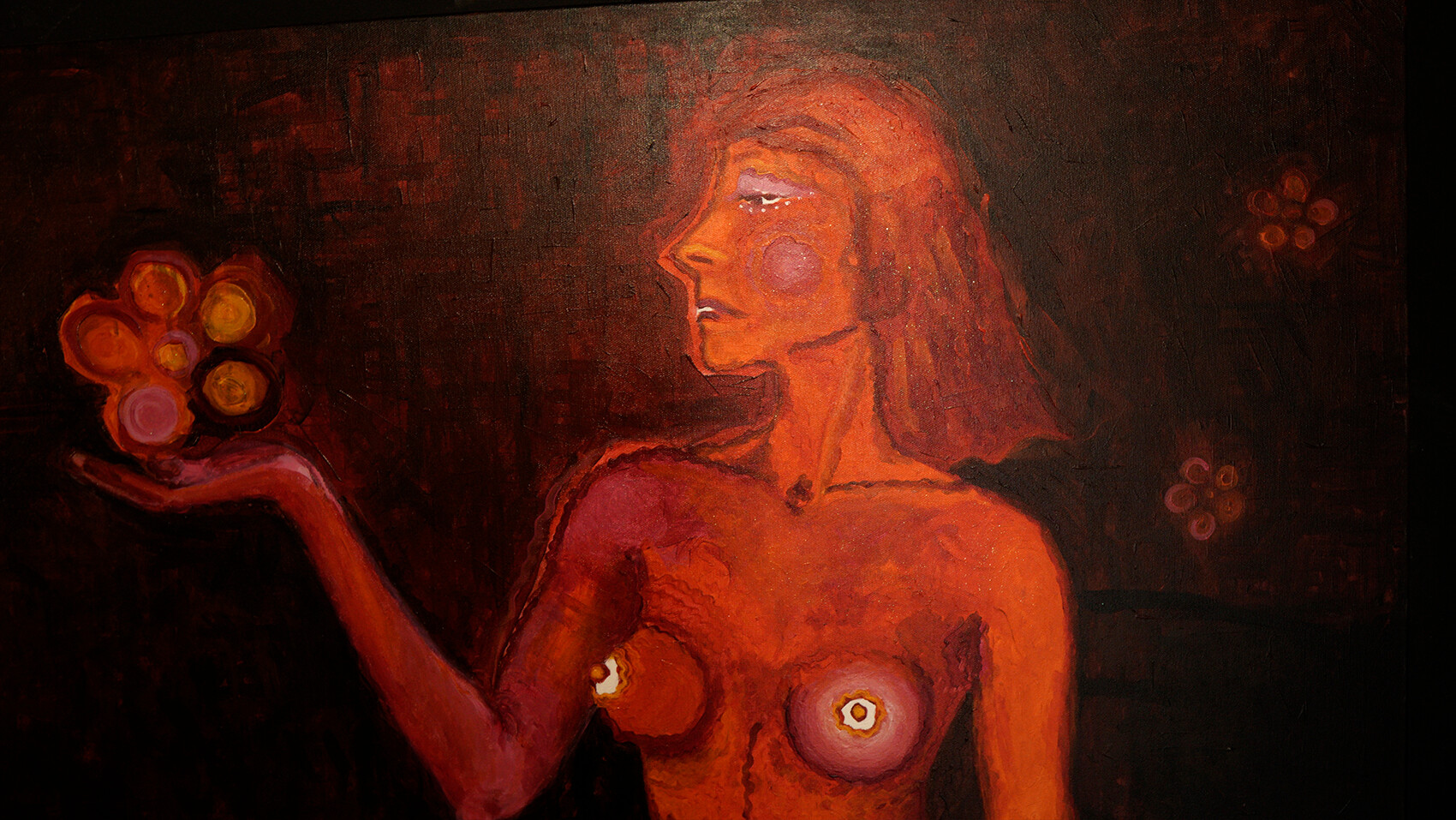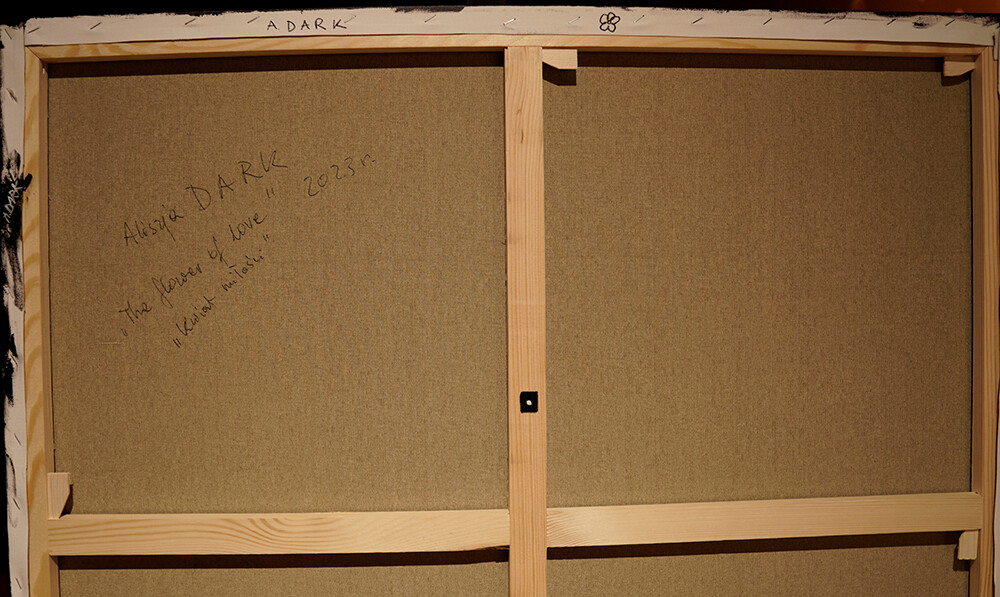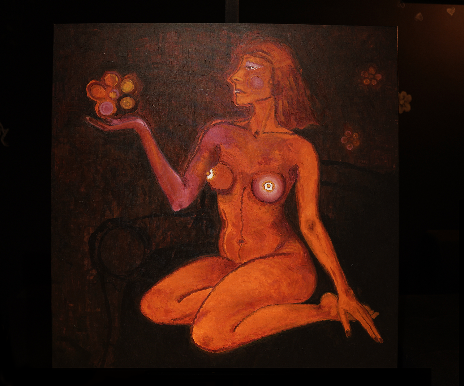 Size: 100/100 cmColors: shades of red, orange, yellow, pink, cherry, dark brown, blackDescription: The woman symbolically raises the titular flower of love. It is the fruit of her internal work on overcoming her own powerlessness, ignorance and unconsciousness. It wouldn't be there if it weren't for a change in thinking and the titular hero of the first oil painting from 2023, A. D A R K - or Mr. Faggio. Hence the previously painted "Flowers of Enlightenment from the DARK ROOM" and "F R E E D O M" - a symbol of spiritual freedom.