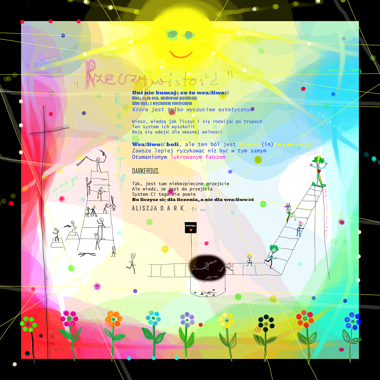 Przedmiot: dzieło cyfrowe (obraz z wierszem w wideoklipie muzycznym, 4K 16:9) zapisane na mini pendrive z logo Aliszja D A R K + Certyfikat Autentyczności